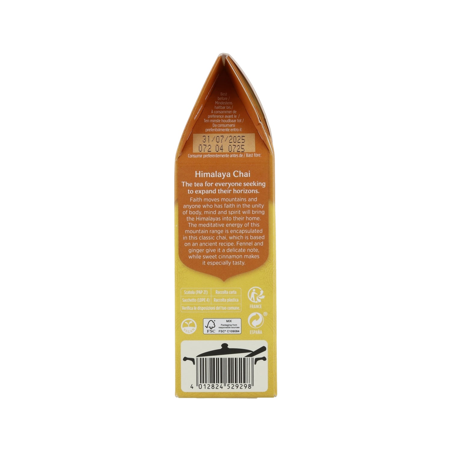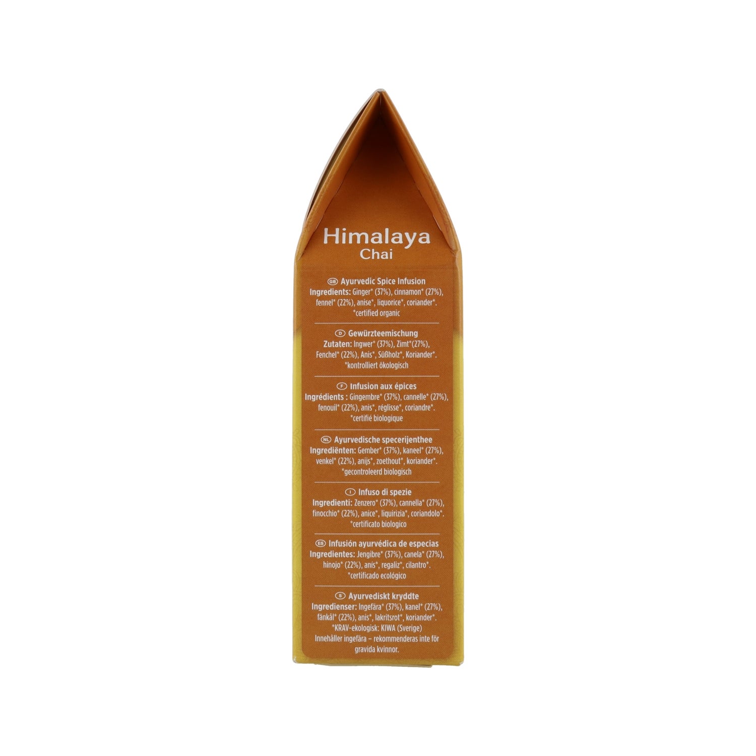 L'infusione di Yogi Tea dell'Himalaya Chai è una ricetta a base di erbe ispirata alla catena montuosa dell'Himalaya, fatta principalmente con finocchio, zenzero, cannella, anice e coriandolo per darvi un gusto delizioso in ogni take. L'essenza di questo infuso è "equilibrio e apertura".