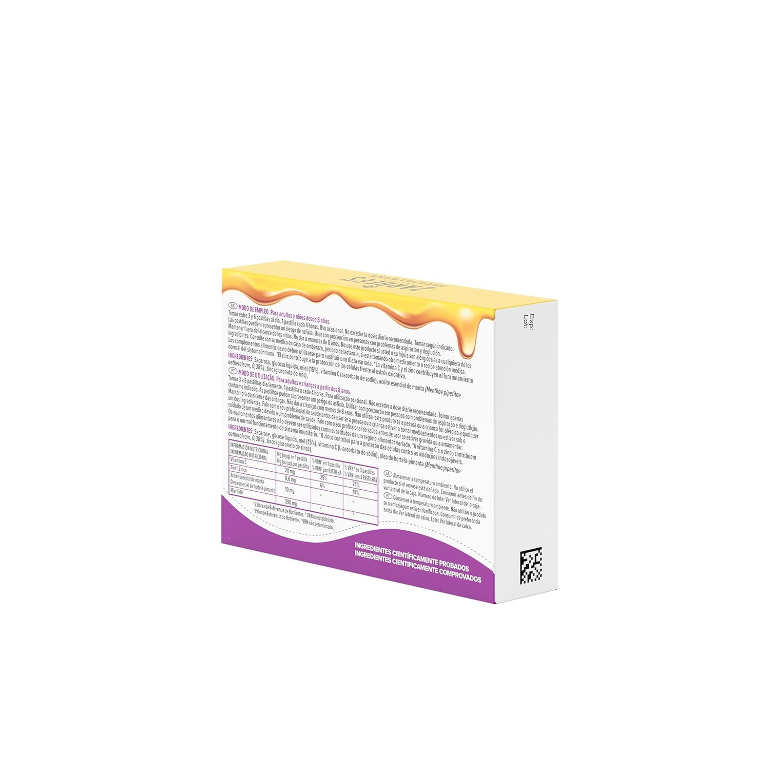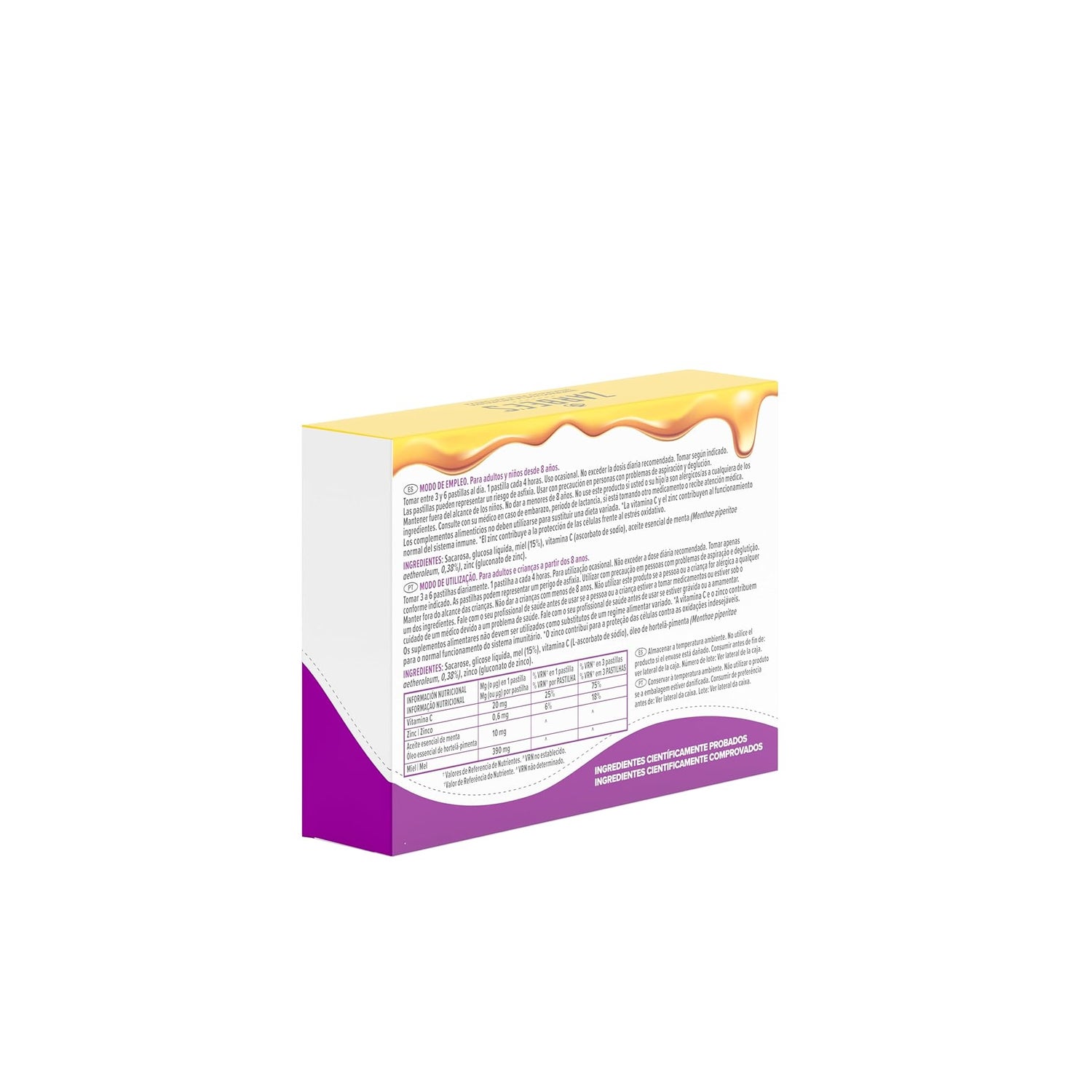 La vitamina C e lo zinco contribuiscono al normale funzionamento del sistema immunitario, e lo zinco contribuisce anche alla protezione delle cellule dallo stress ossidativo. D'altra parte, il miele e l'olio di menta sono due ingredienti noti per la loro efficacia nel calmare il prurito alla gola.