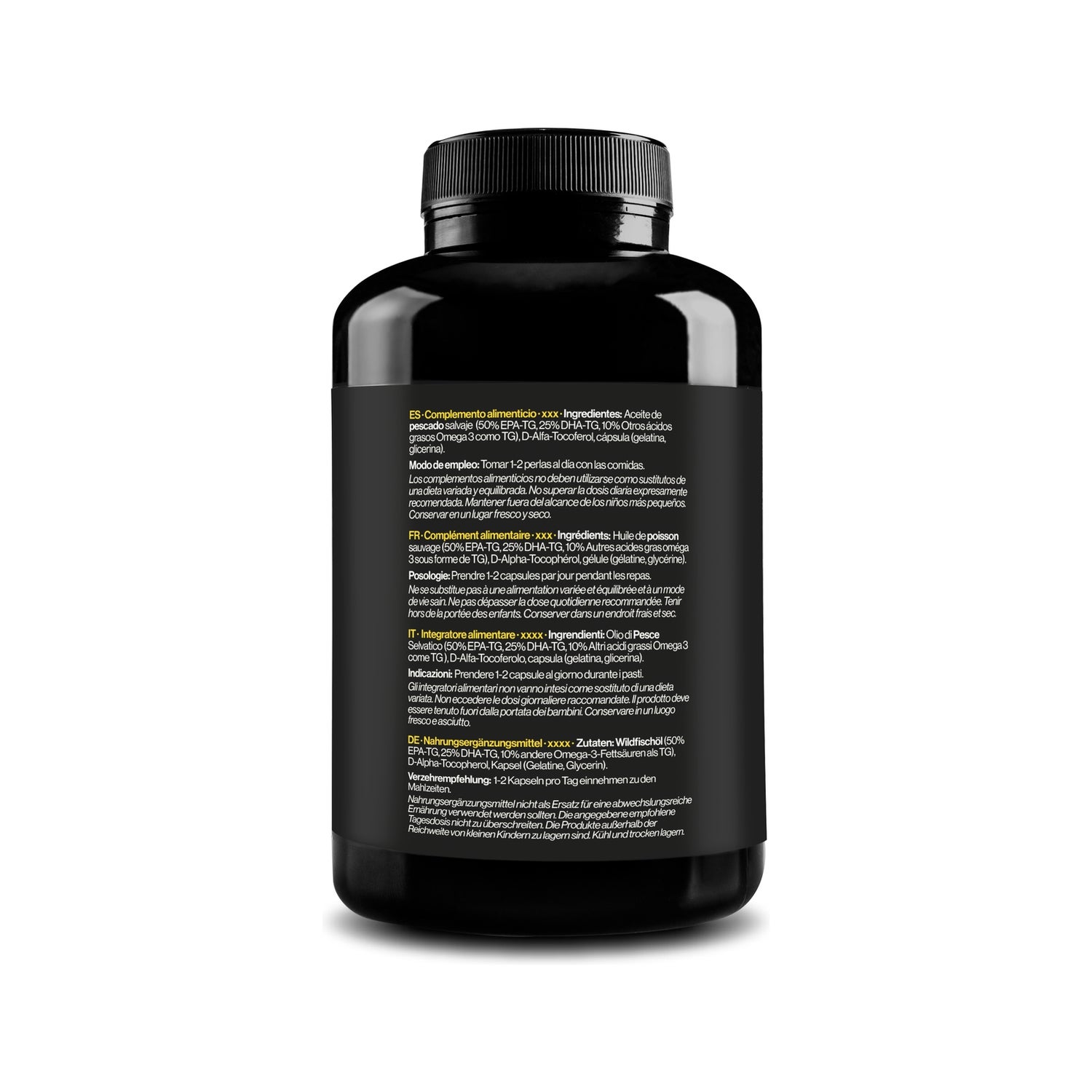 Omega 3 Premium in forma di trigliceridi assicura massima assorbimento ed efficacia con 1000 mg di EPA e 500 mg di DHA per dose (2 capsule). Utilizziamo olio di pesce selvaggio certificato da Friends of the Sea (FOS) per un prodotto puro e sostenibile. Le nostre capsule morbide sono facili da deglutire e sono progettate per proteggere le proprietà dell'olio di pesce. - Trigliceridi per una migliore assorbimento. - Alta potenza di EPA e DHA. - Olio di acciughe certificato FOS.
