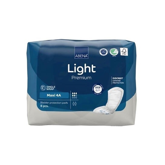 Abena Light Premium Protectores Pads Maxi 4A 8uds is de geavanceerde optie van ABENA voor wie maximale dagelijkse bescherming tegen gematigde urineverlies nodig heeft. Het anatomische ontwerp past zich aan het lichaam aan, wat comfort en discretie garandeert voor actieve mannen en vrouwen.
