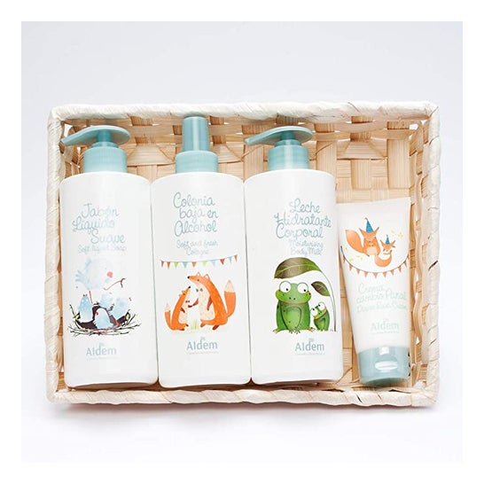 Mand met 4 dermoprotectieve en hygiëneproducten ontworpen voor de gevoelige huid van de baby.
