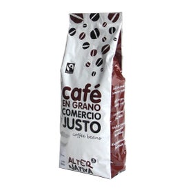 Koffiebonen van biologische oorsprong met een groen certificaat dat garandeert dat het een product is dat is vervaardigd met producten afkomstig uit biologische landbouw en eerlijke handel, waarbij respect voor het milieu centraal staat.