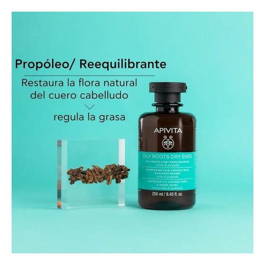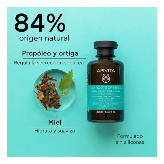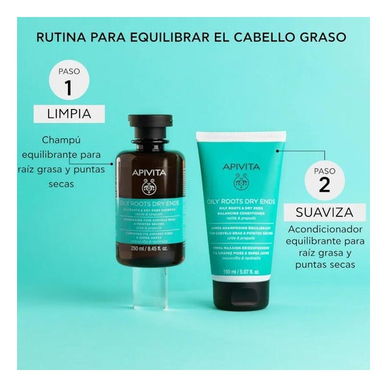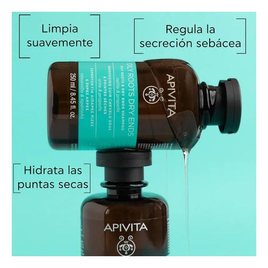 Apivita Capillary Shampoo Greasy Roots and Dry Ends 250ml is een balancerende shampoo voor dagelijks gebruik die het haar in balans helpt brengen, hydratatie biedt en de talgproductie reguleert om ophoping van olie bij de wortel te voorkomen.