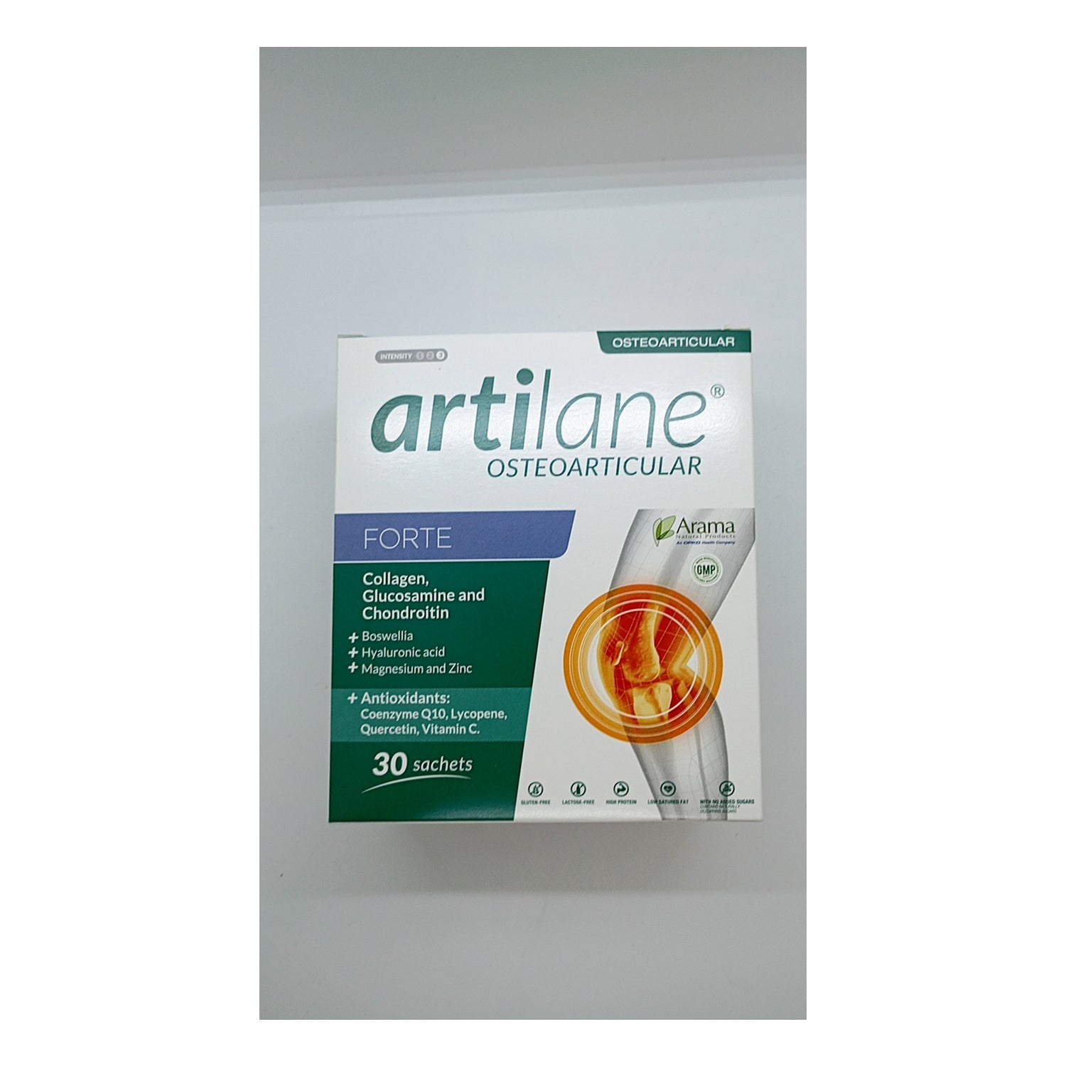 Arama Artilane Forte 30 zakjes is een voedingssupplement voor het onderhoud van gewrichten, spieren en botten. Het product bevat Boswellia oleoresine extract en hoge doses Glucosamine en Chondroïtine. Het bevat ook hyaluronzuur, magnesium, zink, Boswellia en antioxidanten zoals co-enzym Q10, lycopeen, quercetine en vitamine C.