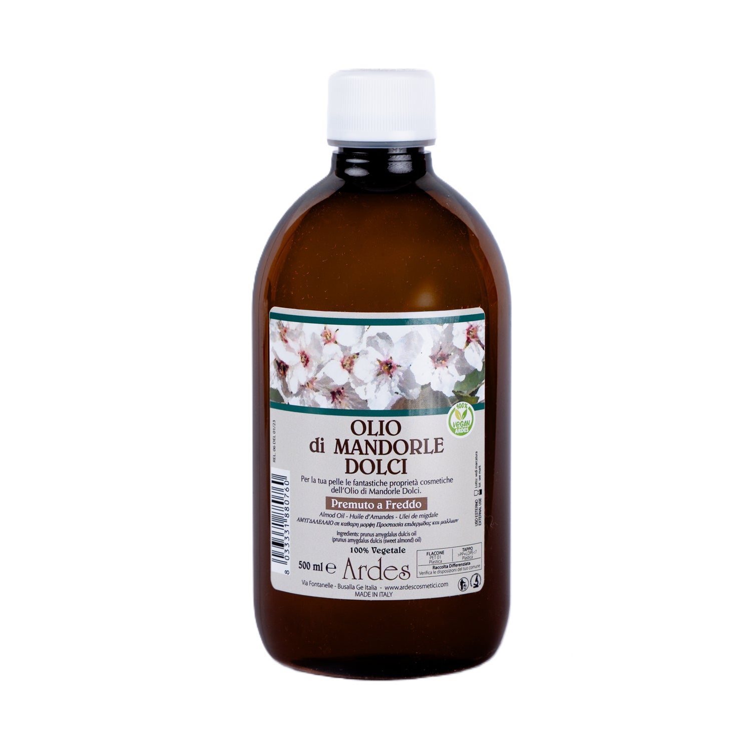 Ardes Cosmetici Amandelolie 500 ml is een 100% natuurlijk product, verkregen door koude persing van de zoete amandelen van de Prunus amygdalus. De pure formule, zonder additieven, behoudt alle antioxidante, voedende en emoliente eigenschappen van deze traditionele olie, waardoor het een authentiek elixer voor de huid is.