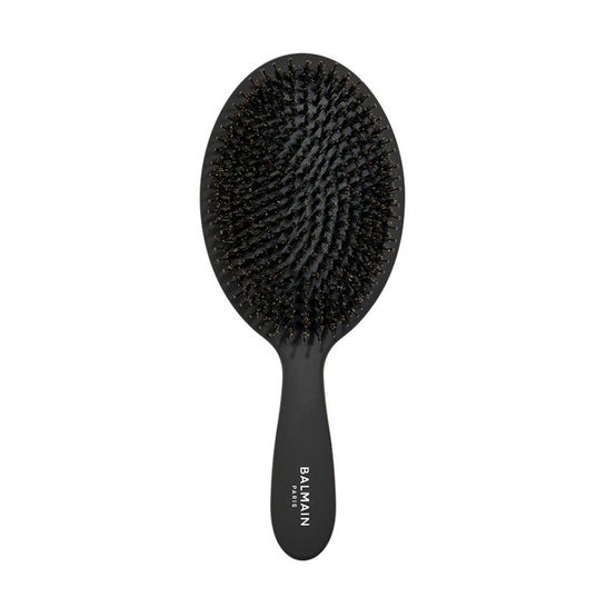 Balmain All Purpose Spa Brush is een professionele borstel die is ontworpen om uitzonderlijke haarverzorging te bieden. De constructie combineert een mix van nylonharen met varkensharen, wat een effectieve interactie met het haar mogelijk maakt. De varkensharen hebben een unieke structuur die de distributie van natuurlijke oliën van de hoofdhuid naar de punten van het haar vergemakkelijkt. Dit draagt bij aan de reparatie van droog haar, vermindert frizz en geeft een gezonde glans. Aan de andere kant zijn de nylonharen stijf en geven ze een zachte massage aan de hoofdhuid, wat de bloedcirculatie bevordert en het haar effectief ontwart. Het ontwerp van de borstel omvat een gebogen handvat, afgewerkt in mat, dat een comfortabele en veilige grip biedt tijdens het gebruik. Dit hulpmiddel is bijzonder geschikt voor haar met grove texturen en middellange tot lange lengtes, en is ook geschikt voor haar met extensions. Bovendien maakt het het ontwarren van het haar mogelijk zonder trekken of schade te veroorzaken.