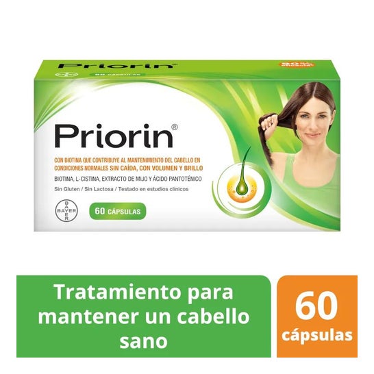 Bayer Priorin® 60 capsules is een voedingssupplement dat is samengesteld op basis van biotine, gierst-extract, tarwekiemolie, L-cystine en vitamine B5. Het helpt het haar te versterken vanaf de wortel, voedt en herstelt de structuur, zorgt voor volume en bevordert de regeneratie en groei van het haar.