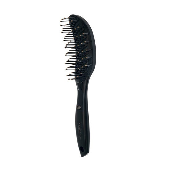 Borstel met een zeer speciaal ergonomisch ontwerp dat zorgt voor grote lichtheid en comfort, past zich aan de gebogen vorm van het hoofd aan en vergemakkelijkt het ontwarren en droogmaken van het haar.