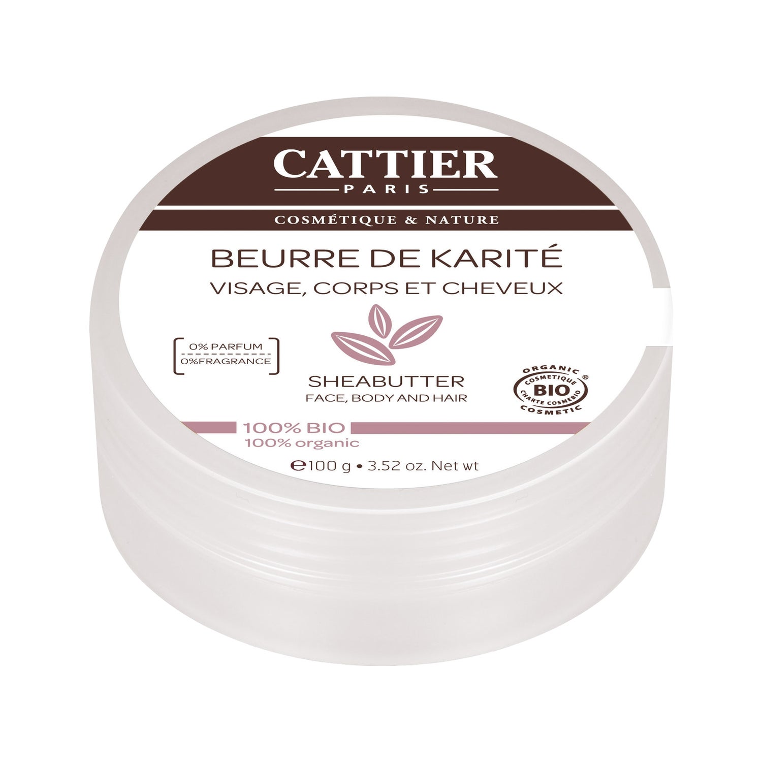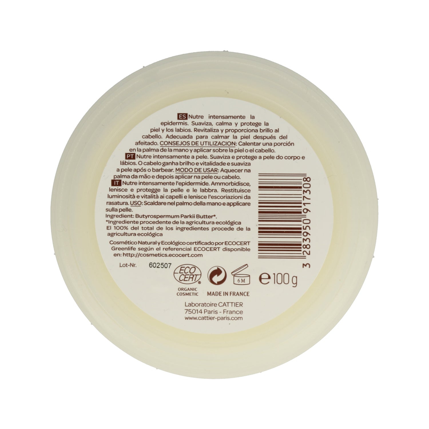 Cattier Organic Shea Butter Face, Hair and Body 100g is een veganistische boter die de huid diep voedt en hydrateert .