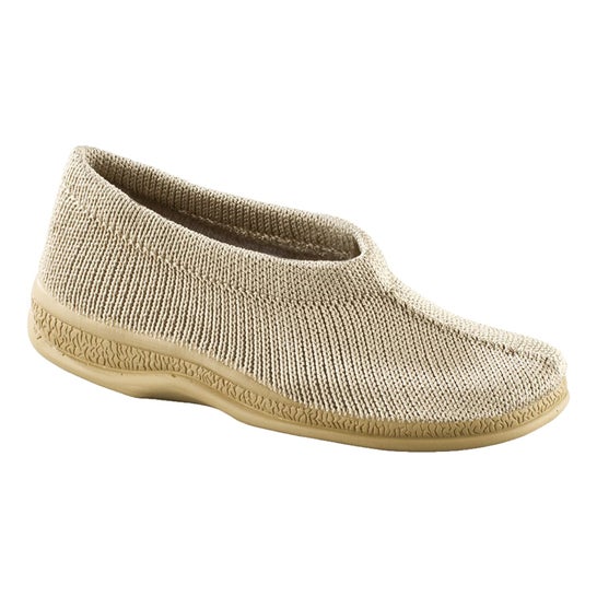Vrouwelijke ballerina-schoen in beige, gemaakt van een mesh die perfect past bij de vorm van de voet, ideaal voor mensen die moeite hebben met het aanpassen aan conventionele schoenen. Het is gemaakt met een uitneembare schokabsorberende schuimvoetbed en een anatomisch gevormde en ergonomische polyurethaan zool die een hoge flexibiliteit en aanpassingsvermogen mogelijk maakt.