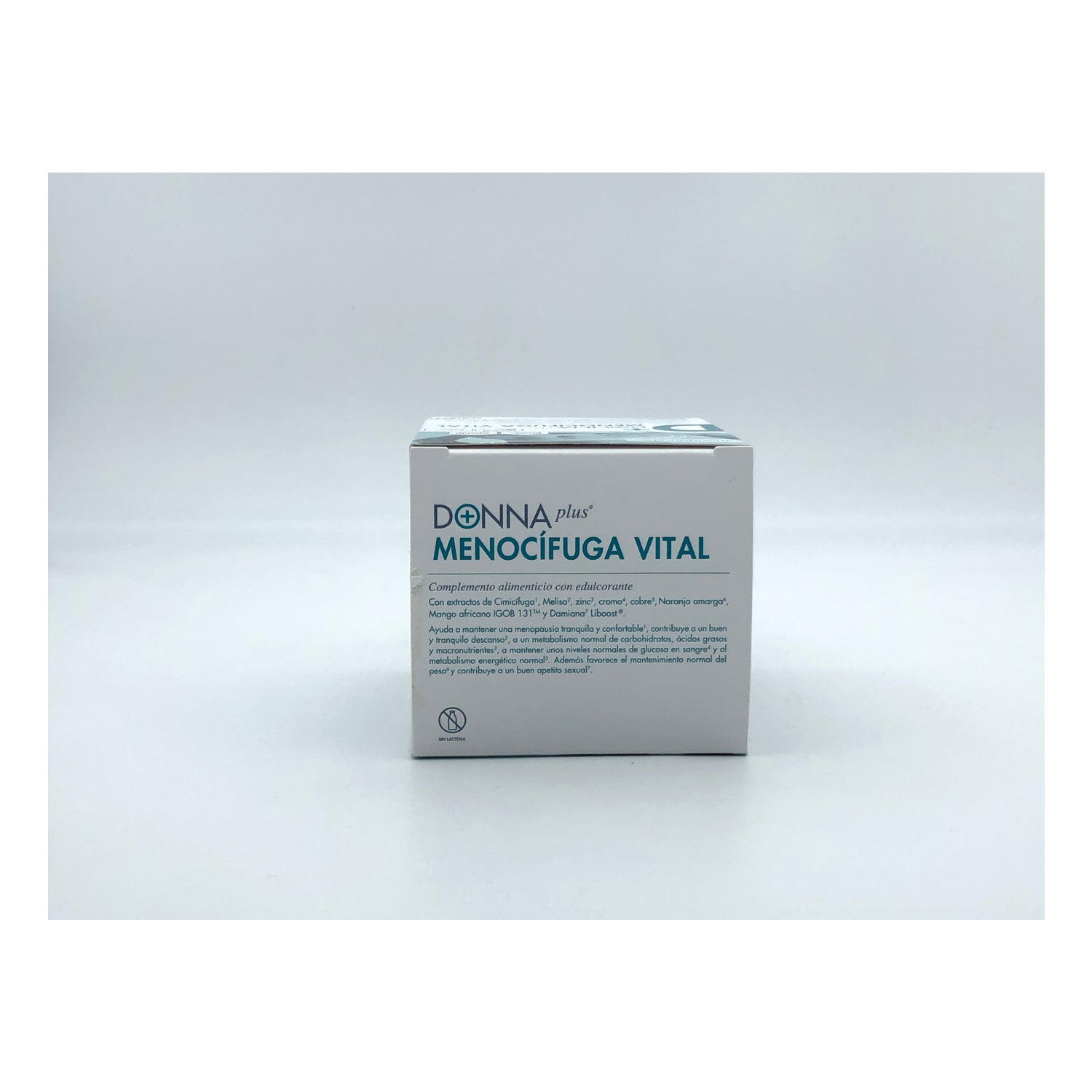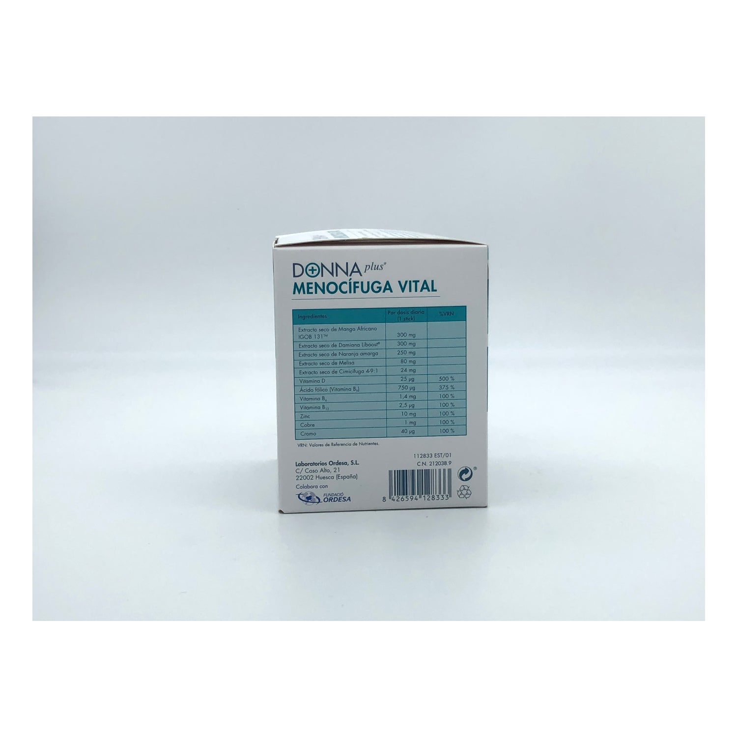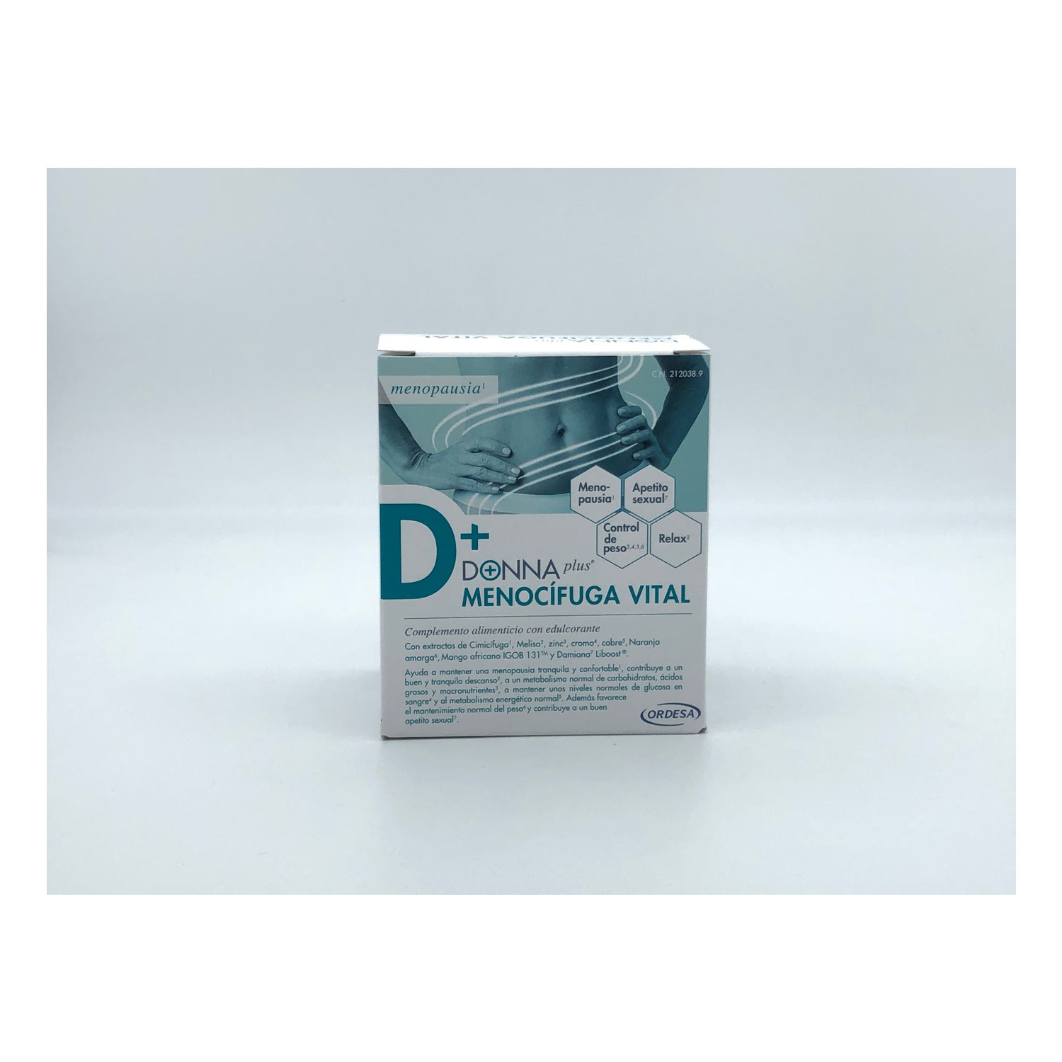 De innovatieve formule van Donna Plus Menocifuga Vital biedt een drievoudig effect met ingrediënten zoals Cimicifuga en Melisse om te helpen omgaan met de symptomen van het climacterium, vitamine D voor het behoud van botten en tanden, vitamines B6, B9 en B12 om vermoeidheid en uitputting te verminderen, chroom, zink en koper voor gewichtsbeheersing en libido, en extracten van Bittere sinaasappel, Damiana en Afrikaanse mango om vitaliteit te bevorderen.