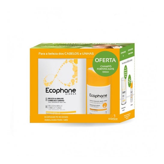 Ecophane Pack Poeder 30 Sachets + Versterkende Shampoo 100ml is een voedingssupplement dat wordt geleverd met een versterkende shampoo. Dit pakket is ontworpen voor de verzorging van haar dat zwakte, schade of gebrek aan glans vertoont.