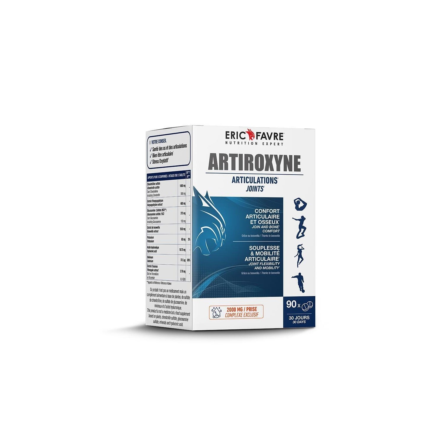 Eric Favre Artiroxyne 90comp is een supplement dat is ontworpen om het gewrichtcomfort te verbeteren en de gezondheid van de gewrichten in het dagelijks leven te verzorgen. De innovatieve formule is gericht op: