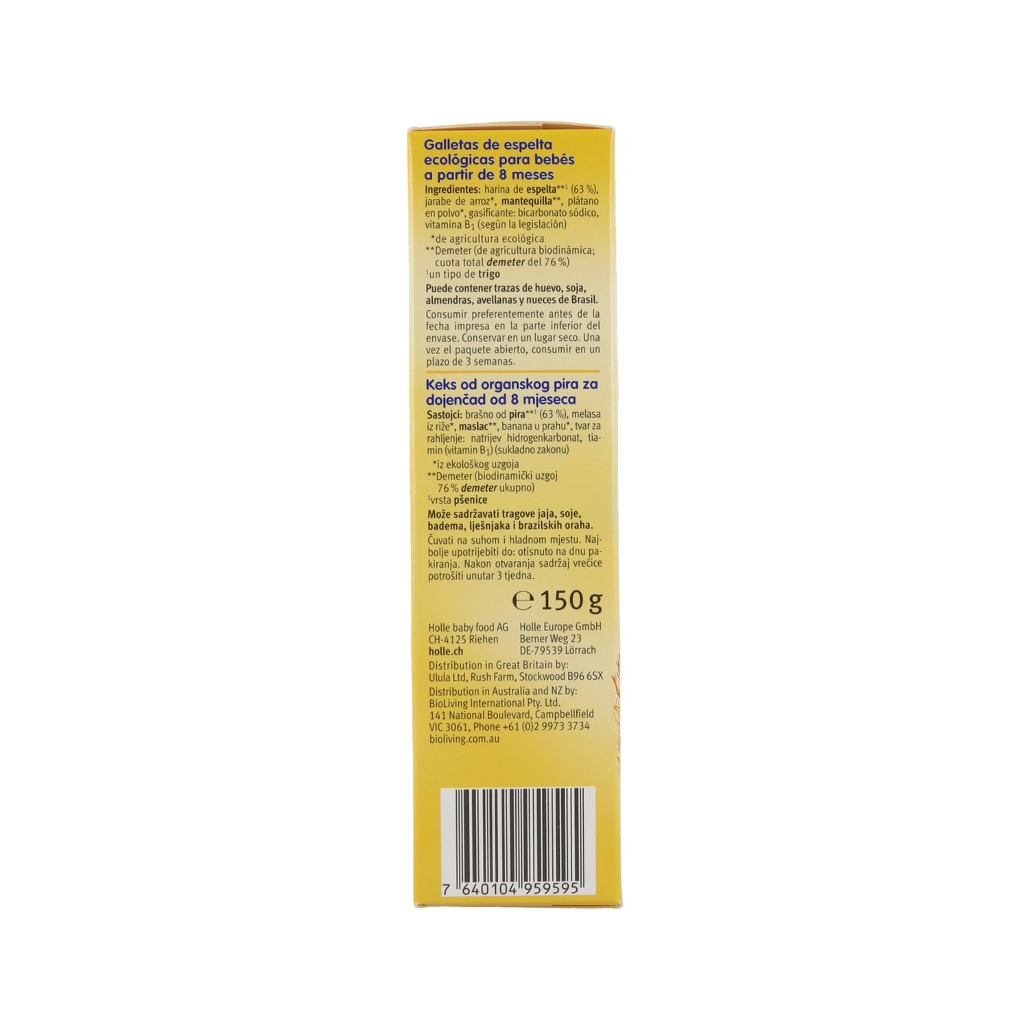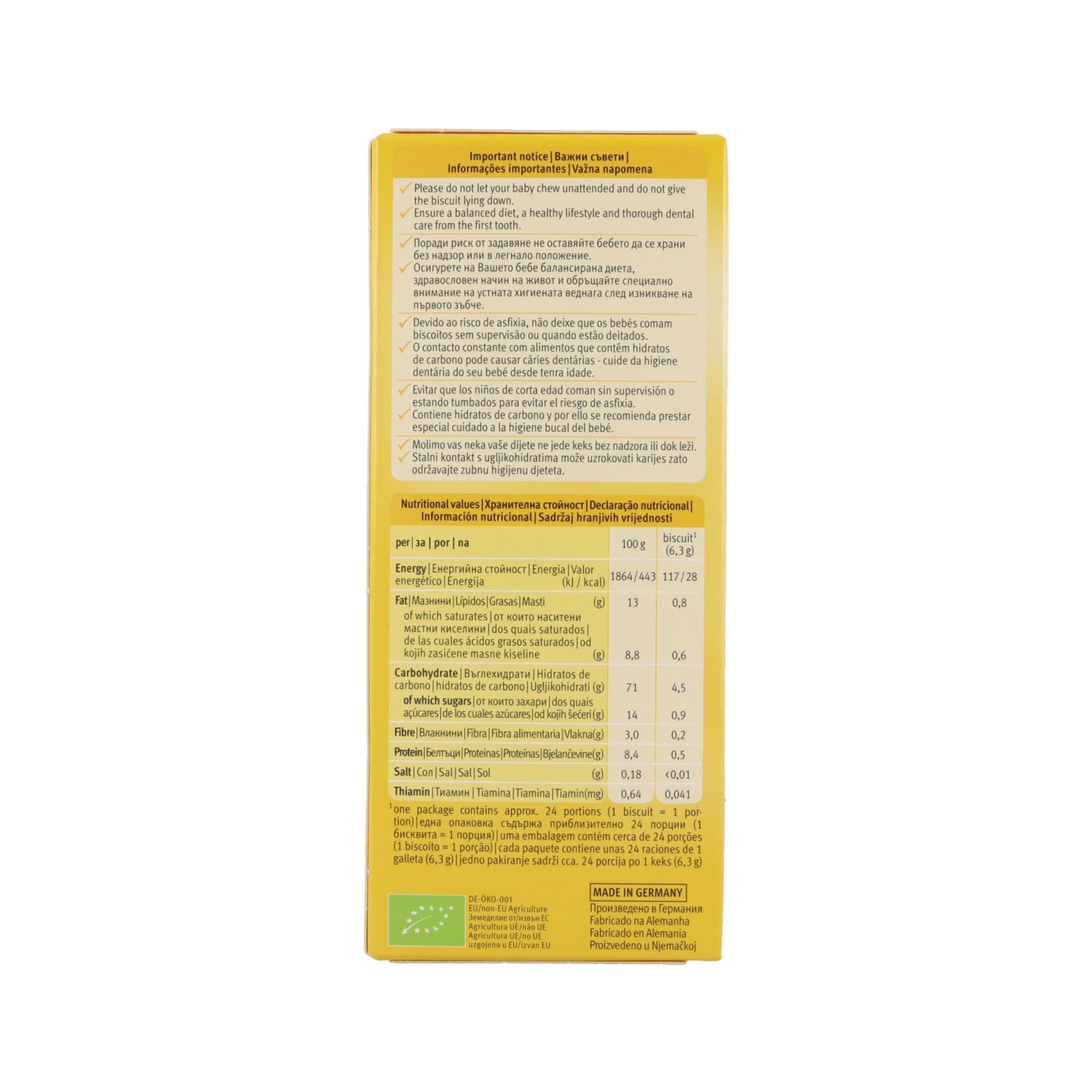 Baby koekjes gemaakt van 100% biologisch volkoren speltmeel. Aanbevolen om bij te dragen tot de complementaire voeding vanaf de leeftijd van 8 maanden. Ze bevatten banaan, boter, rijstzetmeel en natriumbicarbonaat. Ze zijn licht verteerbaar en dragen bij tot een goede ontwikkeling van de kleintjes. Verrijkt met vitamine B1 dat bijdraagt tot de goede ontwikkeling van het centrale zenuwstelsel. Het is een gecertificeerd biologisch product.