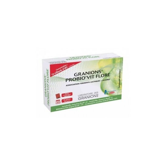 Met een farmaceutische expertise die teruggaat tot 1948, heeft Laboratoire des GRANIONS® GRANIONS® PROBIO'VIT FLORE ontwikkeld, een unieke formule met 14 miljard CFU* aan melkfermenten en gisten per capsule. GRANIONS® PROBIO'VIT FLORE biedt een synergetische combinatie van verschillende stammen:- Lactobacillus helveticus Rosell® 52- Lactobacillus rhamnosus Rosell® 11- Bi?dobacterium longum Rosell® 175- Saccharomyces cerevisiae boulardii CNCM l-1079