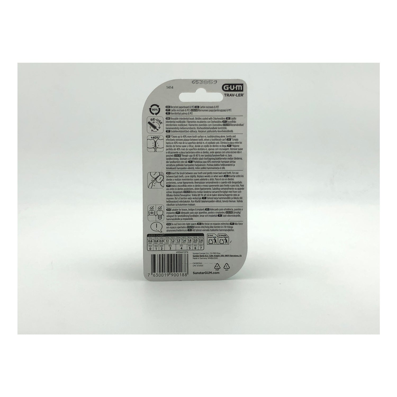GUM Trav-Ler Interdentale Borstel 1.1mm 4st is een interdentale borstel met filamenten bedekt met chloorhexidine, die bacteriën helpt te voorkomen, een kop die tot 90º kan draaien en een afneembare handgreep die ook als dop dient.