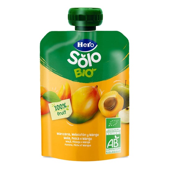 Hero Pouch Appel Perzik Mango 100 g is biologische aanvullende voeding voor baby's vanaf 6 maanden. Het combineert appel, perzik en mango met 100% biologische ingrediënten. Bevat geen toegevoegde suikers of gluten.