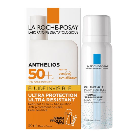 La Roche Posay Anthelios SPF50 Onzichtbaar Vloeibaar 50ml+Eau Thermale 50mlis een Anthelios UVA-beschermingspakket.