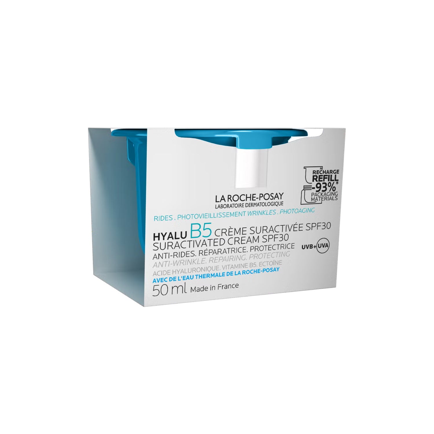 La Roche-Posay Hyalu B5 Suractivated Cream SPF30 Refill 50ml, met 2 soorten hyaluronzuur, vitamine B5 en ectoine om te vullen en te helpen de tekenen van veroudering te corrigeren, de hydratatie te intensiveren, de huidbarrière te herstellen en te versterken, terwijl het de huid beschermt tegen de schadelijke UVB en UVA stralen.