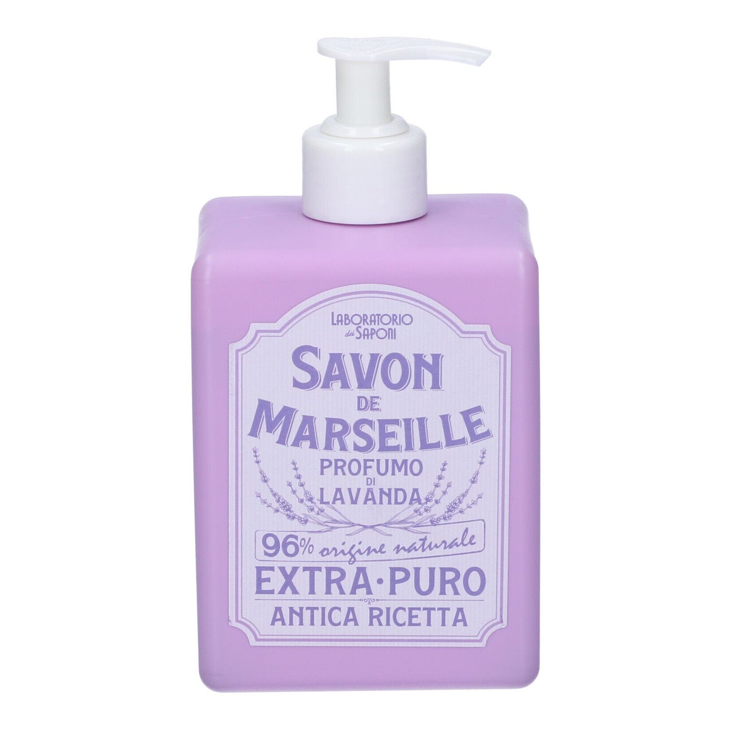 Laboratorio dei Saponi Marseillezeep Lavendel 500 ml voor dagelijkse handreiniging is een vloeibare zeep met dispenser voor dagelijkse hygiëne. Het bevat een natuurlijke formule met plantaardige ingrediënten en een zachte lavendelgeur.