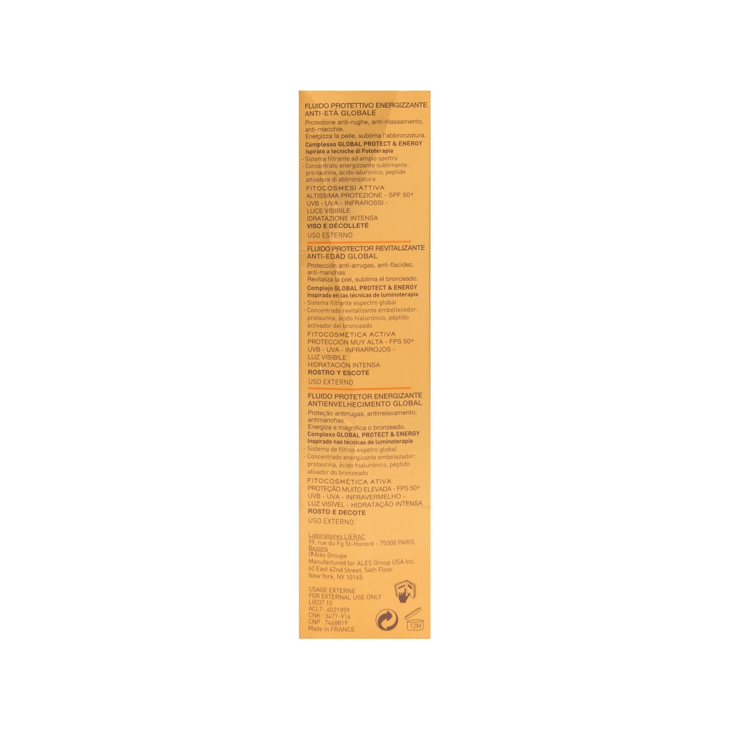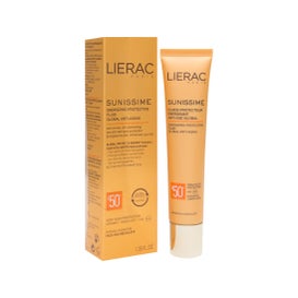 De beschermende vloeibare Sunissime van Lierac , is een zonnescherm voor het gezicht dat schade door zonnestraling voorkomt, met een filtersysteem voor het zonnespectrum dat beschermt tegen zichtbaar licht, infrarode stralen, UVB en UVA, en tegelijkertijd voorkomt de zichtbare tekenen van veroudering van foto's zoals rimpels, verlies van stevigheid en vlekken.