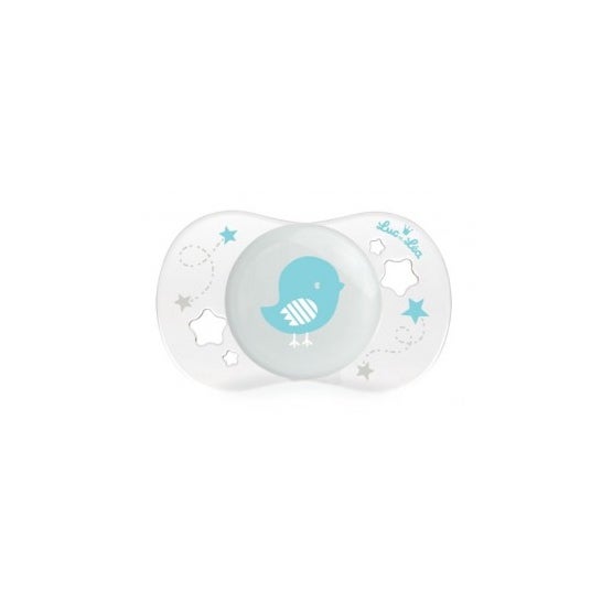 Speen met de afbeelding van een turquoise vogeltje, speciaal ontworpen om te voldoen aan de zuigbehoefte van baby's van 0 tot 2 maanden om hen te helpen kalmeren en troosten. Het heeft een anatomische siliconen speen die zich aanpast aan het gehemelte van de baby en het tandvlees en de tanden respecteert. De gebogen en geventileerde hals voorkomt irritatie door langdurig contact van speeksel op de huid. BPA-vrij. *De kleur en het ontwerp van het product kunnen variëren afhankelijk van de beschikbaarheid.