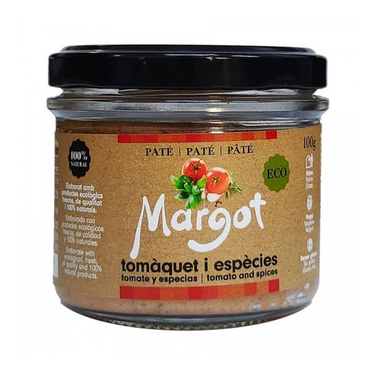 Margot Pate Tomate Especies Eco Vegano 100g is een biologische plantaardige paté, ideaal voor wie op zoek is naar een gezonde en smakelijke optie om te smeren op brood, toast of als begeleiding bij hapjes.