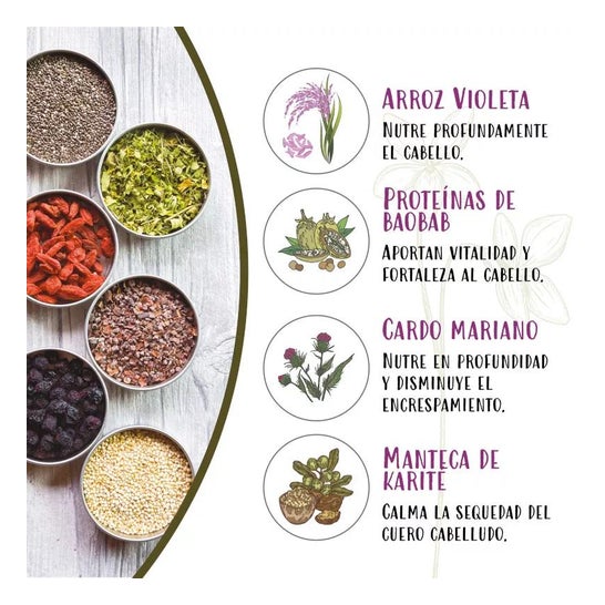 Haarmasker op basis van viooltjesrijst of khao gram, een superfood rijk aan vitaminen, aminozuren, suikers en antioxidanten dat bijdraagt aan een diepe voeding van het haar, het revitaliseert en alle glans en pracht teruggeeft.