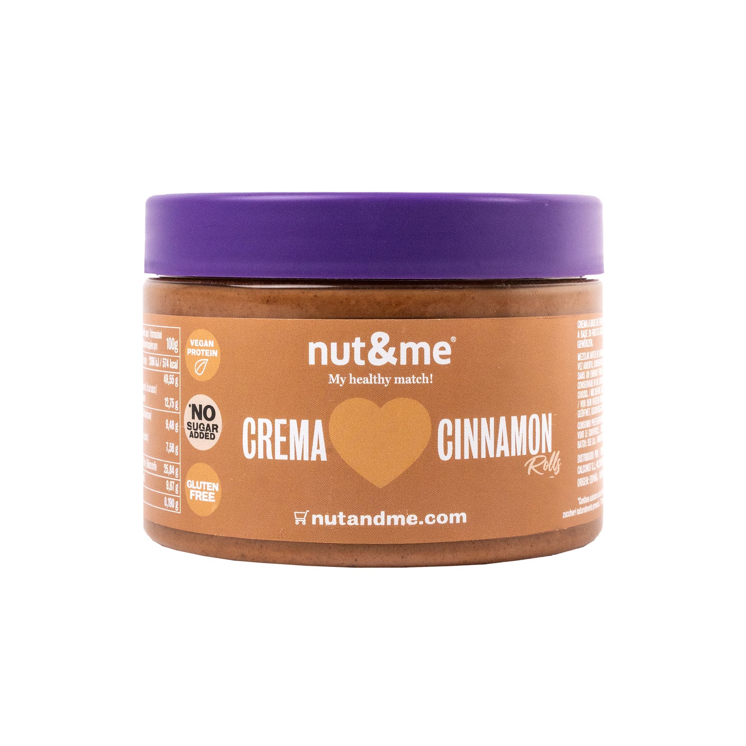 Nut&Me Crema Cinnamon Rolls 250g is een crème die op uitzonderlijke wijze pecannoot en geroosterde amandel combineert, verrijkt met gember en cannelle.