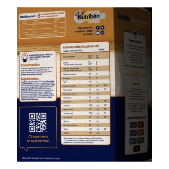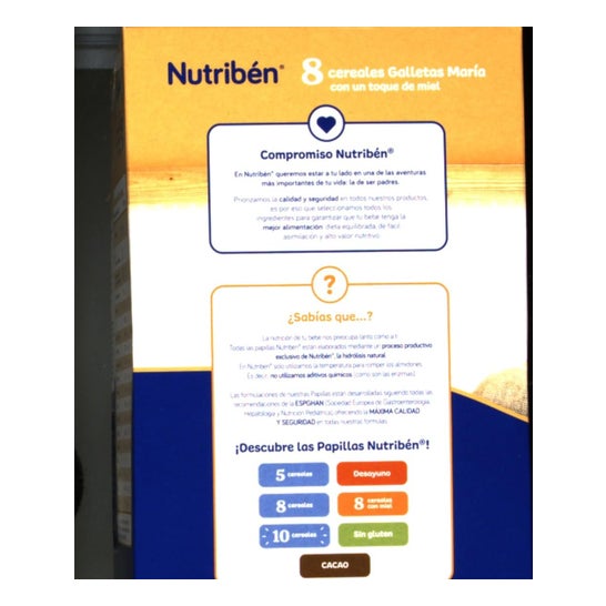 Om de vertering van de baby te bevorderen, worden Nutribén® 8-granen met honing en koekjes gemaakt met in totaal 8 verschillende granen, die het voedingspatroon van het kind in balans houden dankzij het voedzame mengsel van tarwe, gerst, rogge, maïs, rijst, haver, gierst en sorghum.