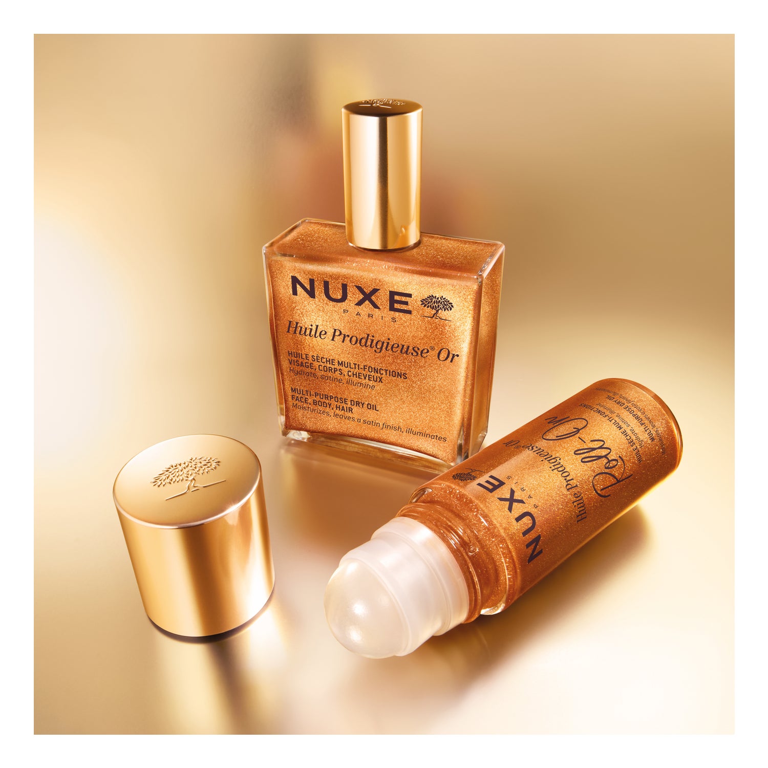 Nuxe Huile Prodigieuse Or Roll-On 60ml is een olie in roll-on formaat voor toepassing op de huid die hydratatie biedt en een satijnen afwerking met gouden glansdeeltjes heeft.