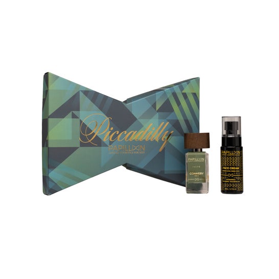 Papillon Cofre Piccadilly Connery Parfum + Face Cream Vitamin C is een exclusieve geschenkdoos die twee hoogwaardige cosmetische producten combineert, ontworpen voor de hedendaagse man. Deze set, van beperkte editie, vertegenwoordigt een viering van de mannelijkheid en wordt gepresenteerd met een unieke armband.