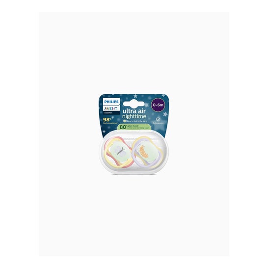 Philips Avent Ultra Air Nighttime Mariposa Gusano 0-6M 2uds is een pack dat twee fopspenen bevat, ontworpen voor baby's van 0 tot 6 maanden. Deze fopspenen hebben brede ventilatieopeningen die ervoor zorgen dat de huid van de baby kan ademen, waardoor deze zacht en droog blijft. De behuizing is licht en heeft afgeronde randen, wat zorgt voor een optimale comfort bij contact met de huid van de kleine.