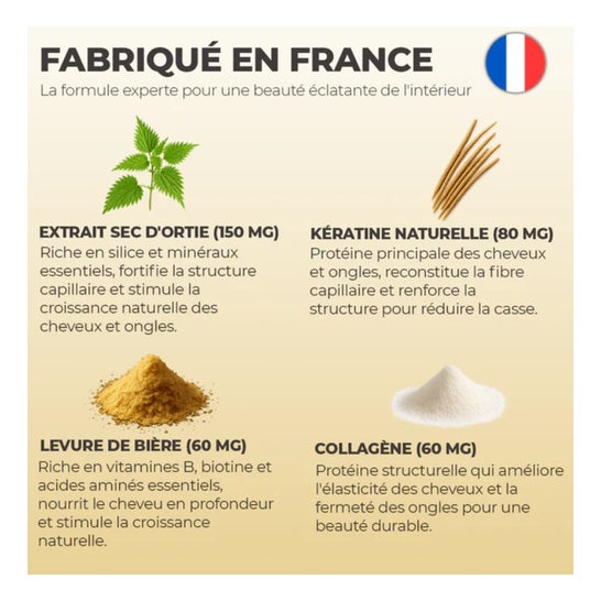 Dit complex combineert zink, keratine, collageen en biergist om het haar en de nagels van binnenuit te versterken. Zink, in de goed opneembare vorm van gluconaat, draagt bij aan het behoud van een goede gezondheid, terwijl de essentiële aminozuren (L-Cystine, DL-Methionine) de natuurlijke productie van keratine ondersteunen.