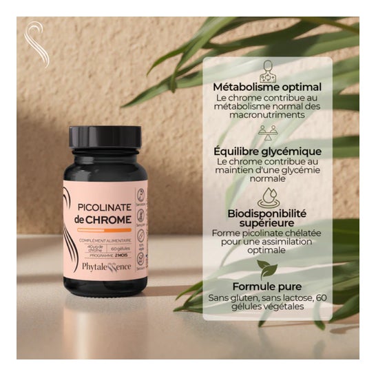 Phytalessence Picolinato van Chroom 60caps is een voedingssupplement dat bijdraagt aan het behoud van een normale glucosespiegel.