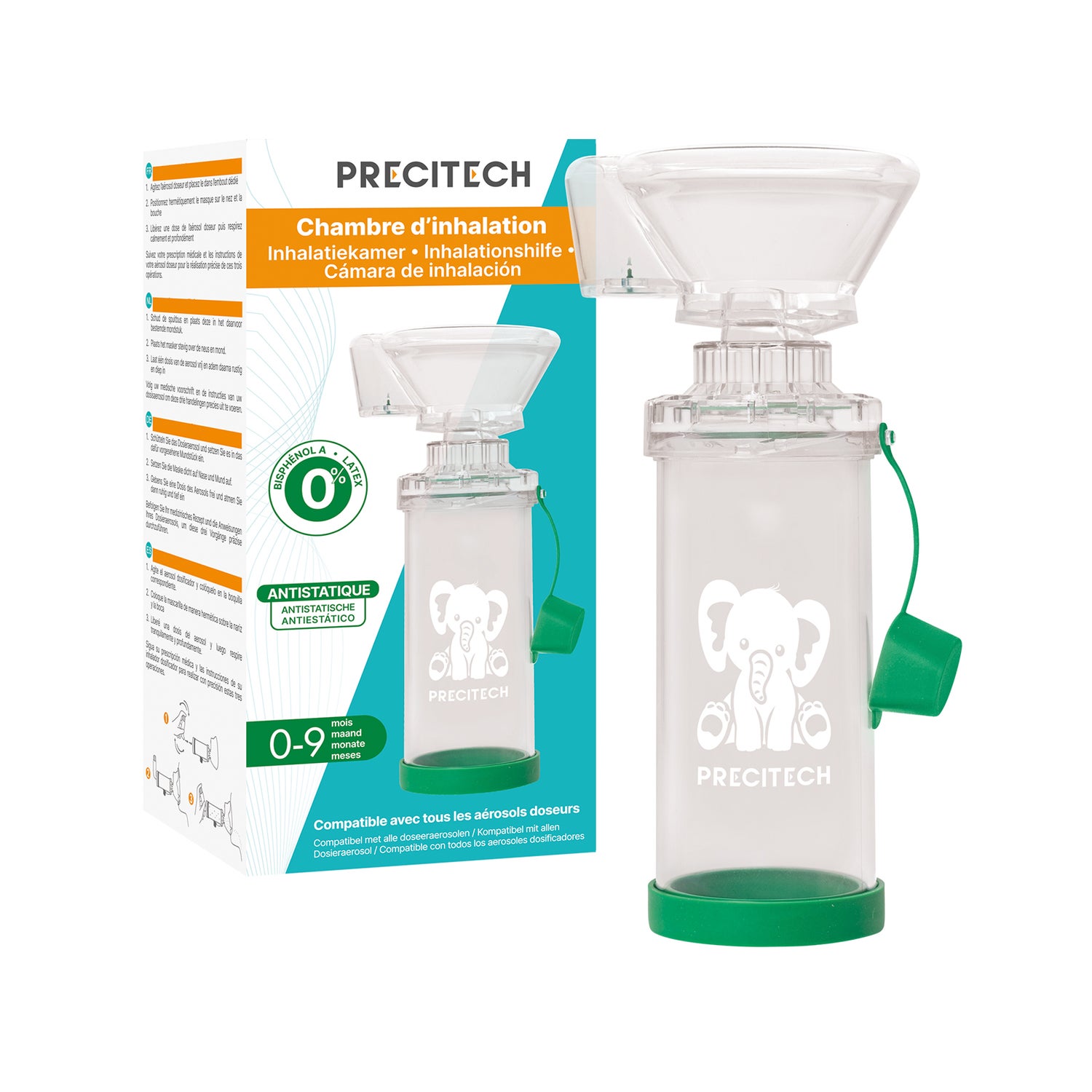 Precitech Inhalatiekamer Baby 0-9 Maanden is een apparaat dat is ontworpen om de toediening van medicijnen via aerosolen aan baby's van 0 tot 9 maanden te vergemakkelijken. De structuur omvat een zachte siliconenmasker, vrij van BPA, dat zorgt voor een comfortabele pasvorm en een optimale afdichting, wat bijdraagt aan een effectieve inhalatie.