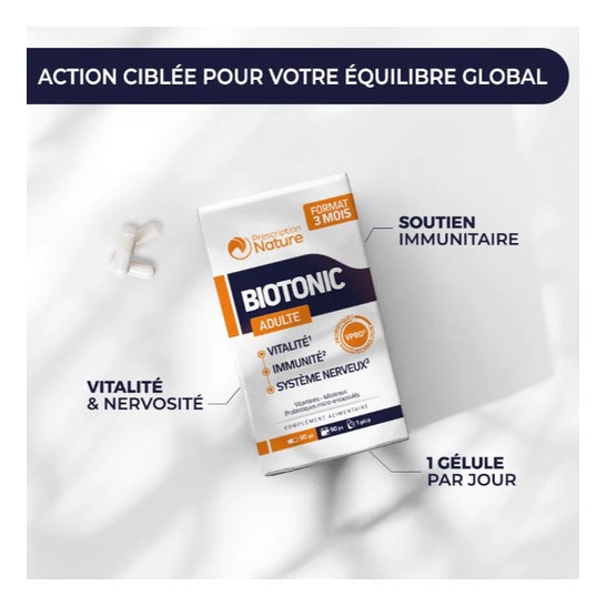 Prescription Nature Biotonic Volwassene 90caps is een complete voedingssupplement, ideaal om de vitaliteit en het welzijn in het dagelijks leven te ondersteunen.