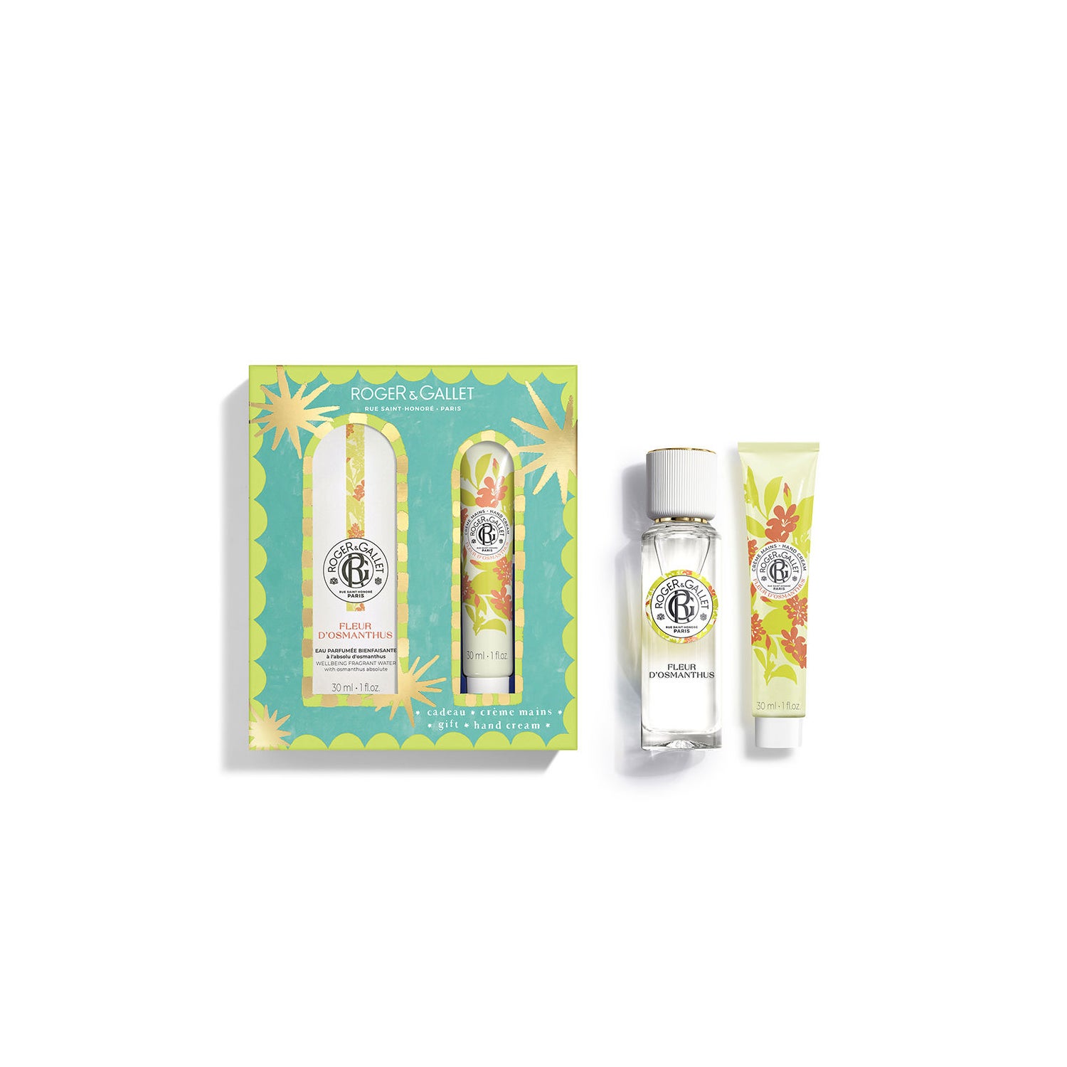 Roger & Gallet Flor de Osmanthus Pack Geurwater + Handen verzamelt een revitaliserend geurwater en een hydraterende handcrème voor een dagelijkse welzijnsritueel met de bloemige frisheid van osmanthus.