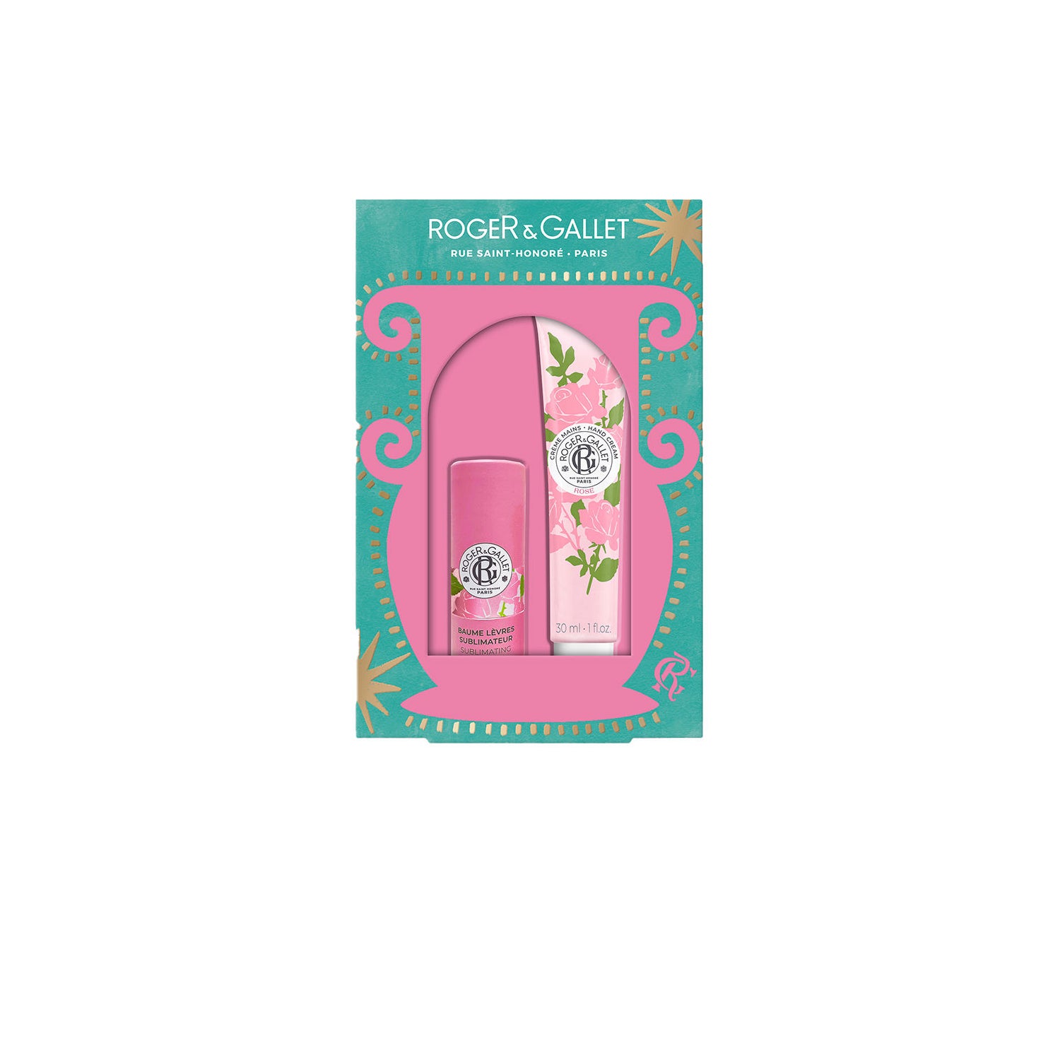 Roger & Gallet Rosa Pack Lippenbalsem + Handcrème bevat een lippenbalsem en een handcrème om droge lippen en handen te hydrateren en te verfraaien, met de zachtheid van de Damascena roos. Gemaakt in Frankrijk, bevat het veganistische formules die dermatologisch getest zijn.
