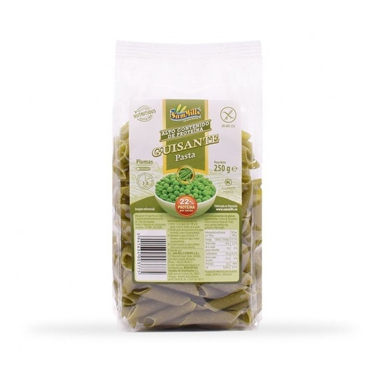 Macaroni gemaakt van erwtenmeel, aanbevolen als eiwitbron. Erwten zijn een bron van vitamines C, K, A en B en mineralen zoals calcium, natrium, ijzer, zink, selenium, kalium en fosfor. Ze bevatten oplosbare vezels die de cholesterol verlagen en zorgen voor een evenwichtige bloedsuikerspiegel. Ze dragen bij aan een verbeterde stemming. Met ingrediënten afkomstig van biologische teelt.