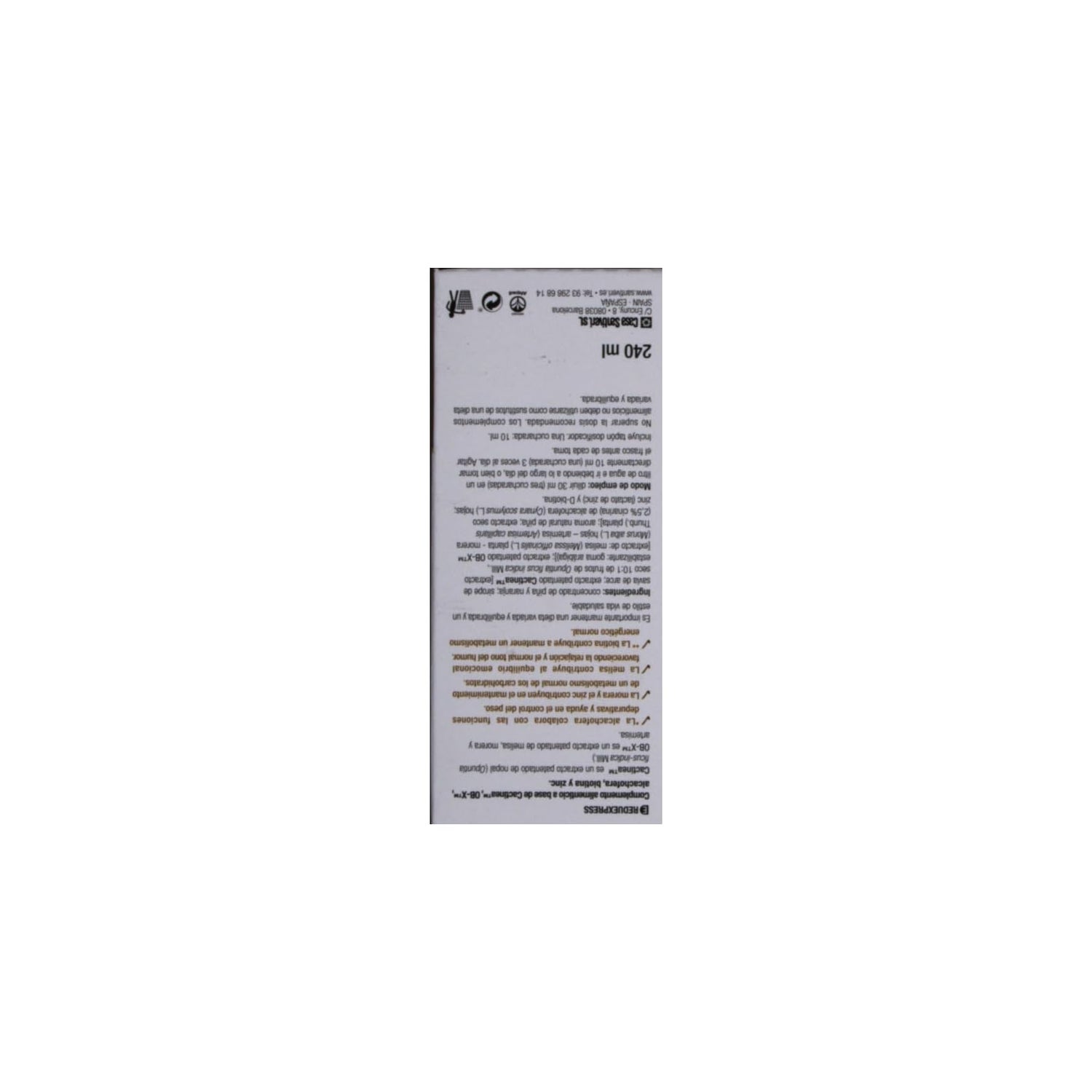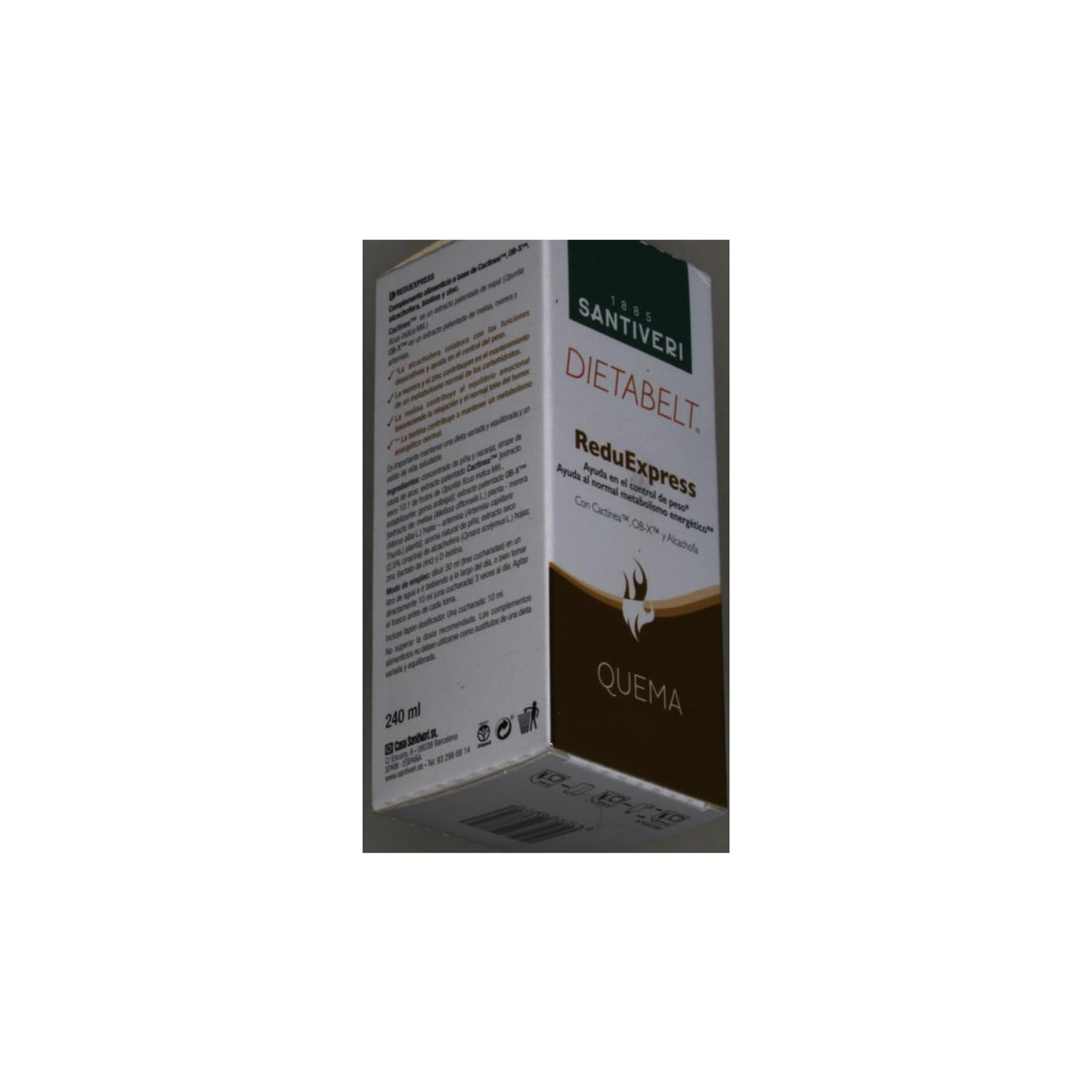 Santiveri Db Quema Reduexpres 240ml is een voedingssupplement met nopalbladeren, speciaal ontwikkeld om in te werken op buik- en visceraal vet. Het helpt het silhouet van de taille te verbeteren dankzij de formule met Cactinea, een gepatenteerd extract van nopalbladeren.