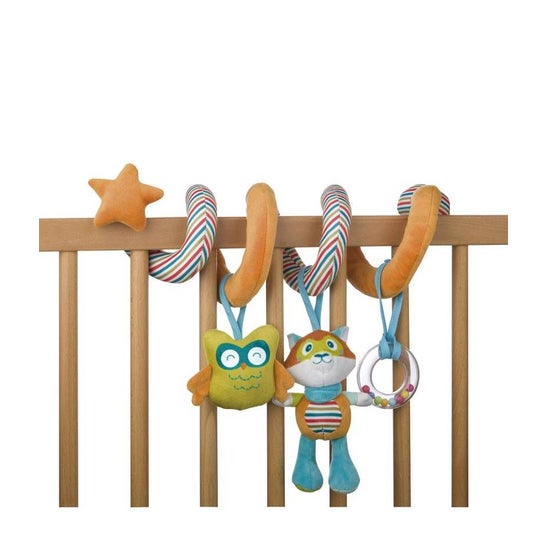 Stoffen spiraalspeelgoed met ingebouwde rammelaars. Model verkrijgbaar in zachte pastelkleuren. Helpt de creativiteit en verbeelding van de kleintjes te stimuleren. Ideaal om aan de wieg of kinderwagen te bevestigen. Geschikt voor baby's vanaf 4 maanden.
