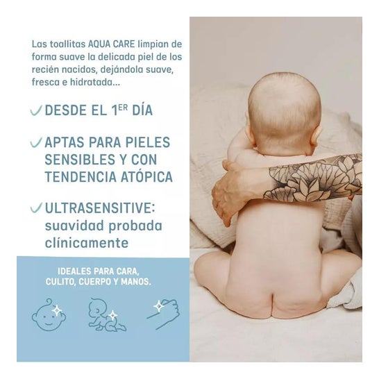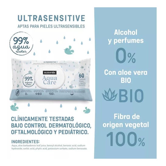 Suavinex Aqua Care Doekjes 60 stuks zijn ultrasensitieve doekjes die voornamelijk uit water bestaan, ideaal voor baby’s met zeer gevoelige huid en een neiging tot atopische dermatitis. Ze zijn vrij van alcohol en parfum, en bevatten biologische aloë vera en 100% plantaardige vezels. Ze zijn klinisch getest en het wordt aanbevolen ze na gebruik niet door het toilet te spoelen. Geschikt vanaf de eerste levensdag.