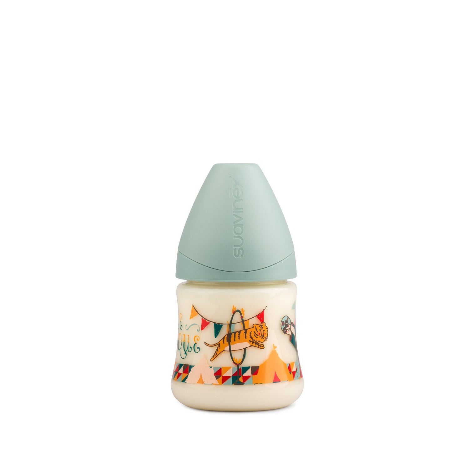 Suavinex Babyfles M1S Groen Circus 150ml. *Productkleur en -ontwerp kunnen variëren naargelang beschikbaarheid.