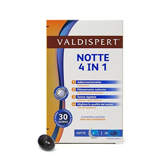 Valdispert Notte 4in1 is een voedingssupplement dat is ontworpen om een herstellende slaap te bevorderen. De complete formulering biedt 4 acties om de kwaliteit van de nachtelijke slaap te verbeteren.