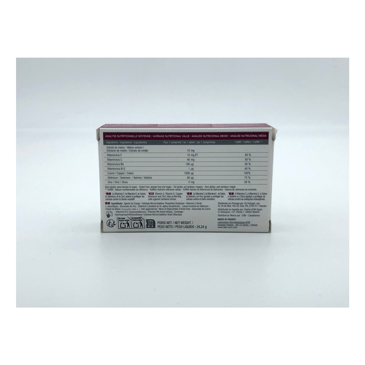 De antioxidante formule draagt bij aan de cellulaire bescherming en het behoud van de huidgezondheid.