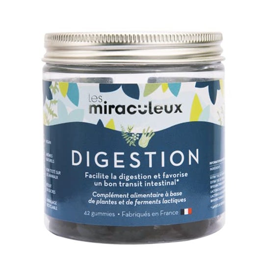 Les Miraculeux Digestion 42 Gummies is een voedingssupplement dat de spijsvertering bevordert en de darmtransit stimuleert. De formule is samengesteld uit venkel, zwarte karwij en 4 stammen van melkfermenten die de darmflora in evenwicht helpen brengen en de spijsvertering verbeteren. Ondanks hun snoepvorm en textuur hebben deze gummies een zeer laag suikergehalte, met slechts 15 kcal voor 2 gummies. Natuurlijke appel- en lycheesmaken.100% recyclebare potjes en deksels.Made in France.Voedingssupplementen mogen nooit een gezond en evenwichtig dieet vervangen.