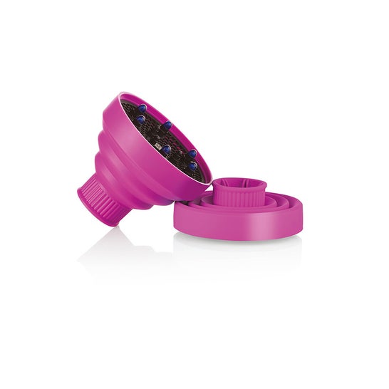 Fuchsia gekleurde opvouwbare diffuser voor het drogen van krullend en golvend haar. Hij is geschikt voor alle soorten drogers met een lengte van meer dan 20 centimeter en een universeel mondstuk. Het bevat 9 vingers die een homogene warmte leveren, zonder de haarvezel te verbranden. Met een ontwerp dat na het opvouwen het volume vermindert, waardoor het gemakkelijk op te bergen en te vervoeren is. Gemaakt van thermo-isolerende silicone, die geen warmte afgeeft aan de handen. Hij past op alle soorten haardrogers met een lengte van meer dan 20 centimeter.