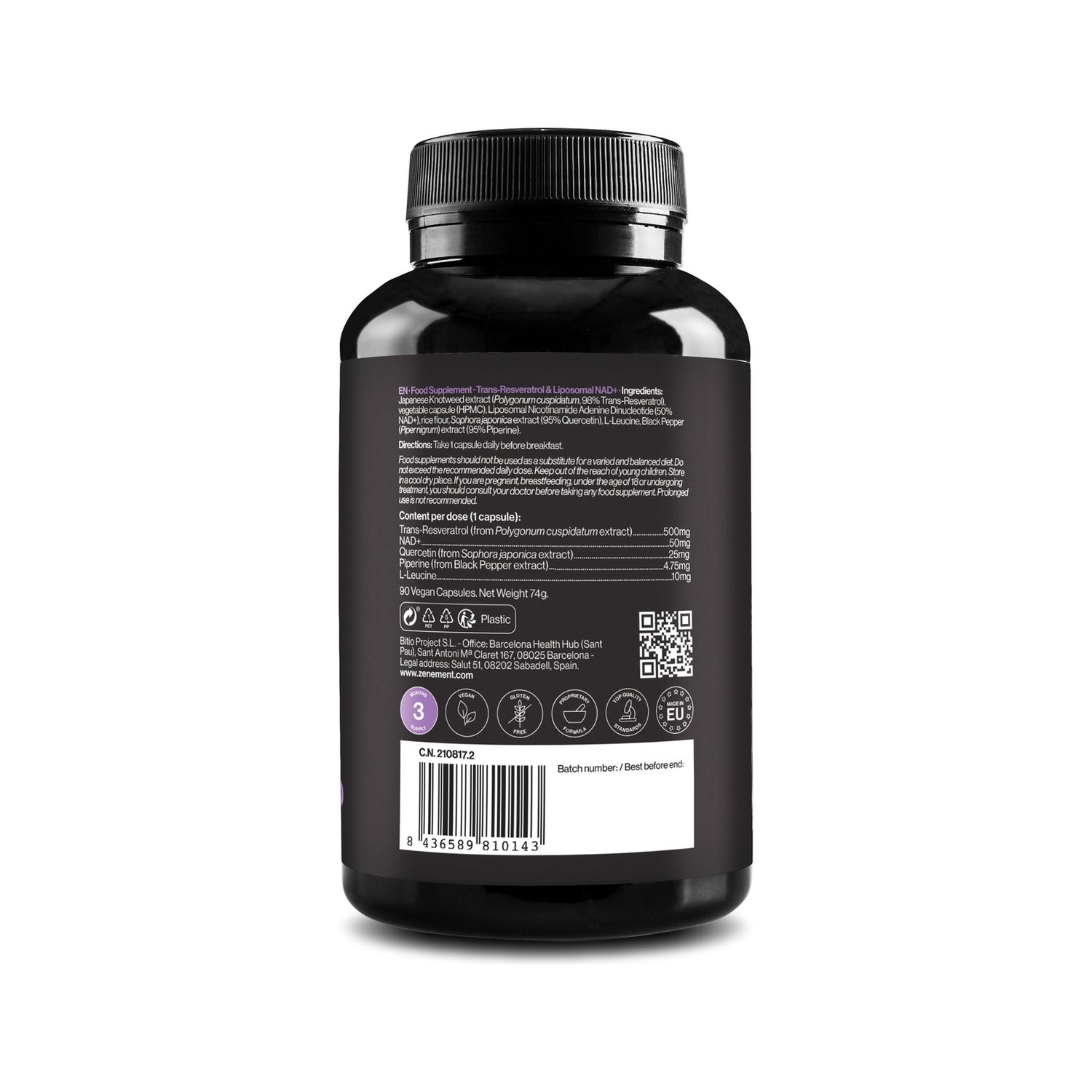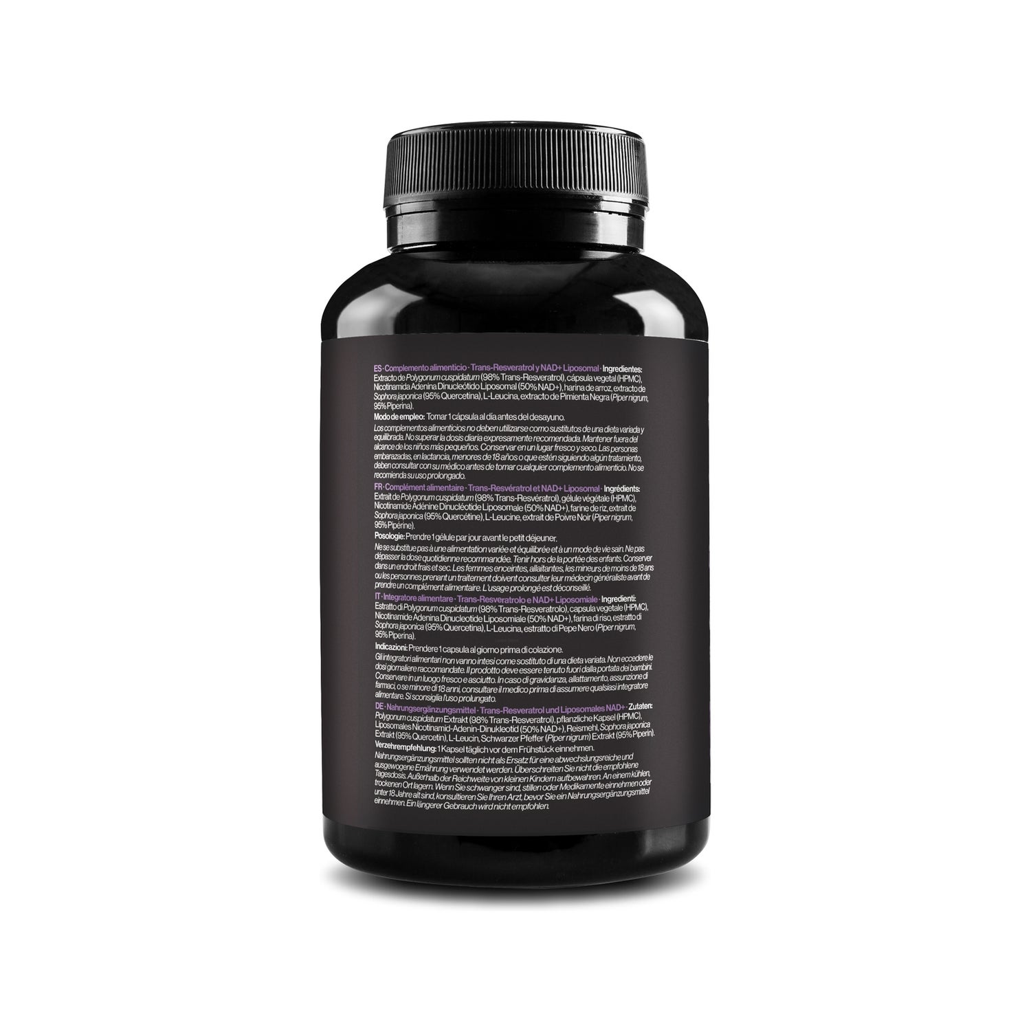Gemaakt op basis van pure trans-resveratrol (98%), 100 mg liposomaal NAD+, quercetine en piperine die ondersteuning biedt voor het bevorderen van een gezonde cellulaire veroudering. Bovendien is liposomaal NAD+ geformuleerd met een technologie die de bio-beschikbaarheid en absorptie verbetert.