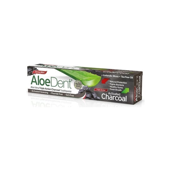 ALOEDENT TRIPLE ACTION CHARCOA to pasta do zębów zawierająca aktywny węgiel drzewny i wzbogacona aloesem, idealna do zapobiegania próchnicy i utrzymania dobrego stanu zdrowia jamy ustnej. Pasty do zębów AloeDent mają wyjątkową zdolność do równoważenia poziomu pH w jamie ustnej przez co najmniej 5 godzin. Ponadto produkt ten w naturalny sposób pomaga zwalczać takie problemy jak zapalenie dziąseł, owrzodzenia jamy ustnej, ubytki i kamień nazębny.